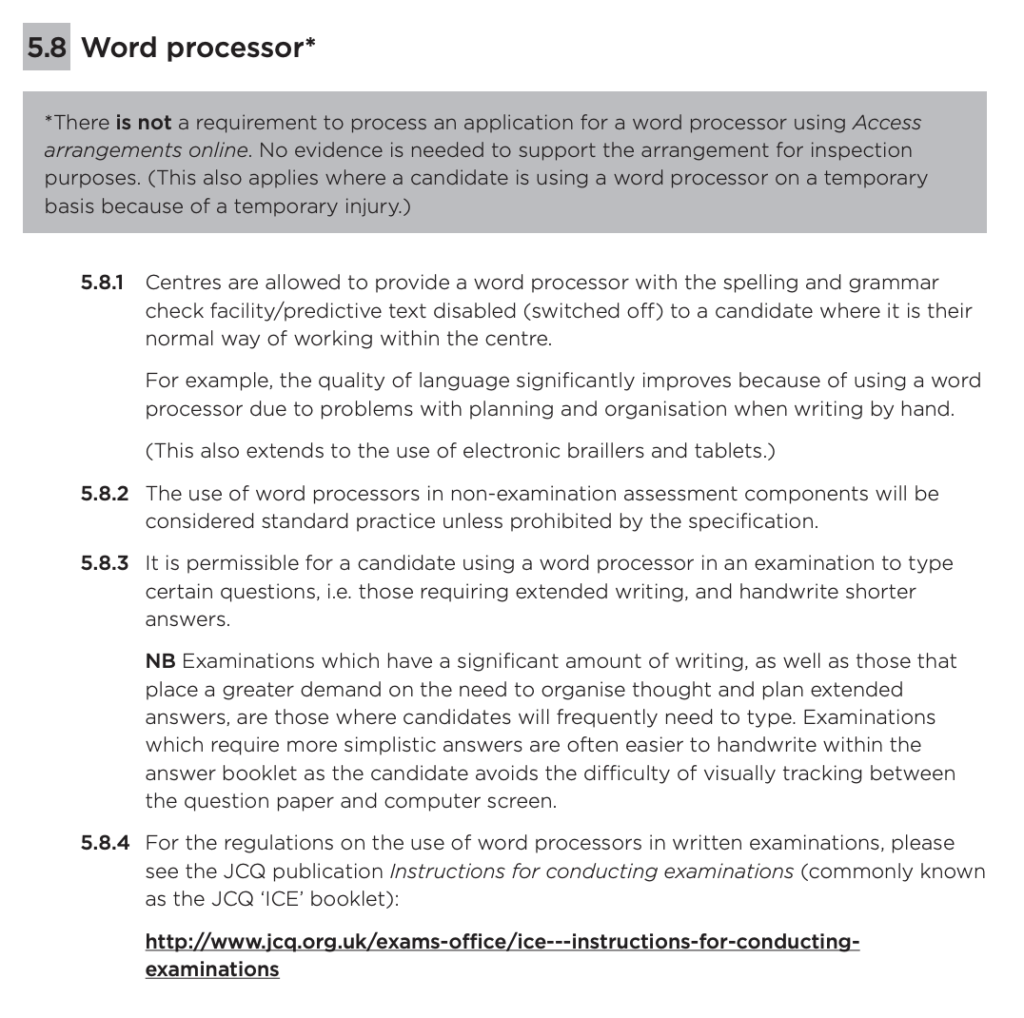 According to Ofqual, who are responsible for all the exam rules in the UK, your school or college doesn’t need to prove you have a disability or learning need to get you typing in your exam. They get to choose who gets to type on their own.